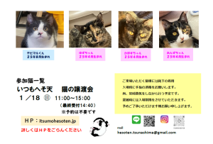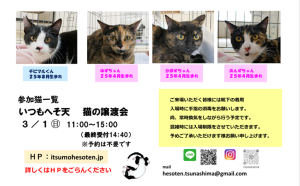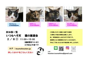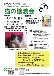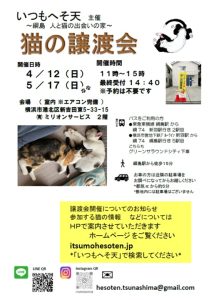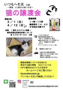 猫の譲渡会を第1または第2 日曜日に下記住所にて予定しています