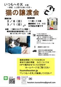 猫の譲渡会を第1または第2 日曜日に下記住所にて予定しています